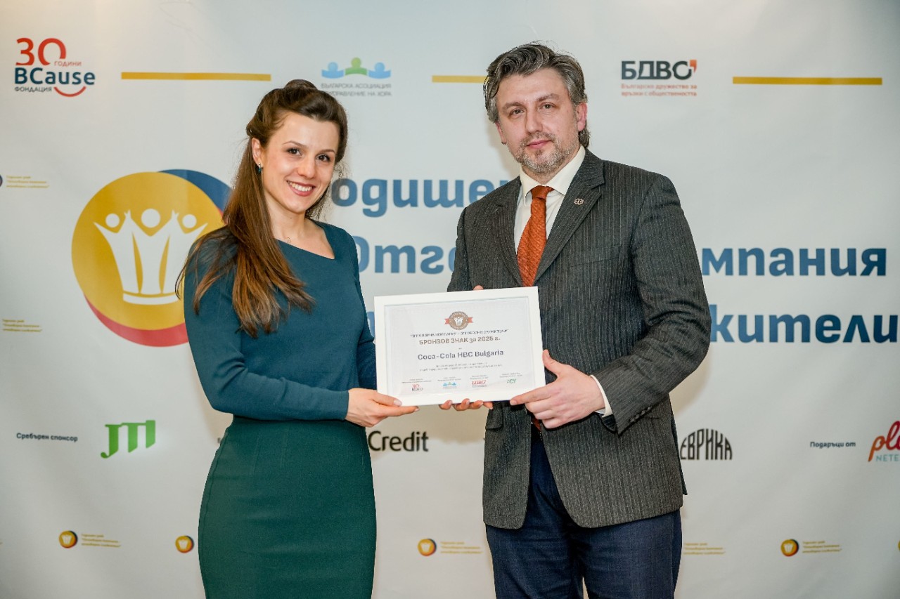 Coca-Cola HBC Bulgaria received the Bronze Annual Badge for 2025 in the initiative of BCause Foundation, which recognizes companies that encourage employee engagement in socially significant causes. The annual “Responsible Company – Responsible Employees” awards are being organized for the twelfth consecutive year in partnership with the Bulgarian Association for People Management (BAPM), the Bulgarian Public Relations Society (BPRS) and the Association of Sustainability Professionals (ASP).